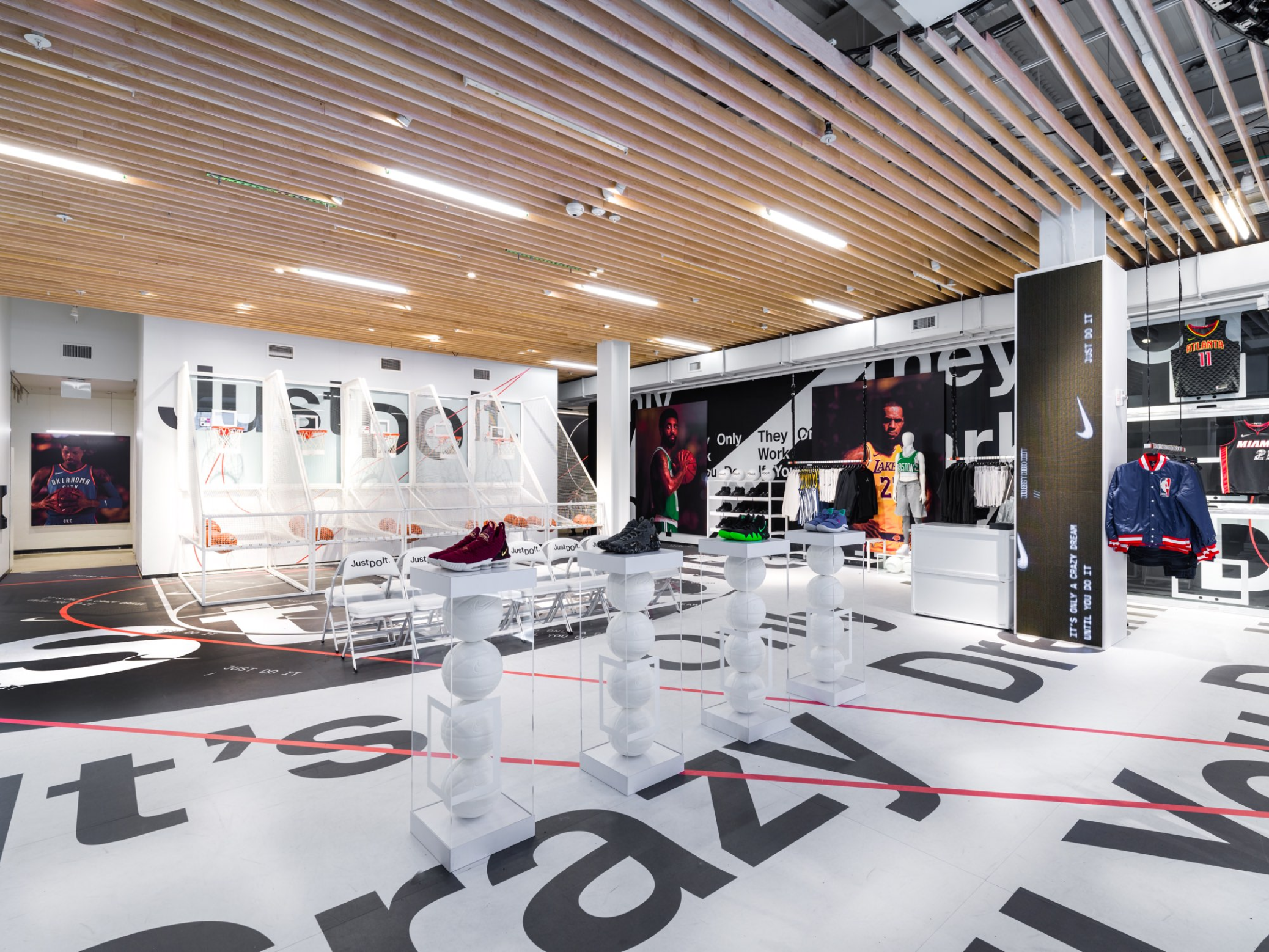Our solution involved the creation of a dynamic 2D taping system that seamlessly extended across all product categories and featured multiple athletes. This system effectively conveyed product details, sport information, athlete profiles, and campaign messaging alongside captivating and moody photography. The incorporation of this 2D system into a 3D space transformed the Nike Soho store, enveloping every surface in the immersive holiday campaign experience.